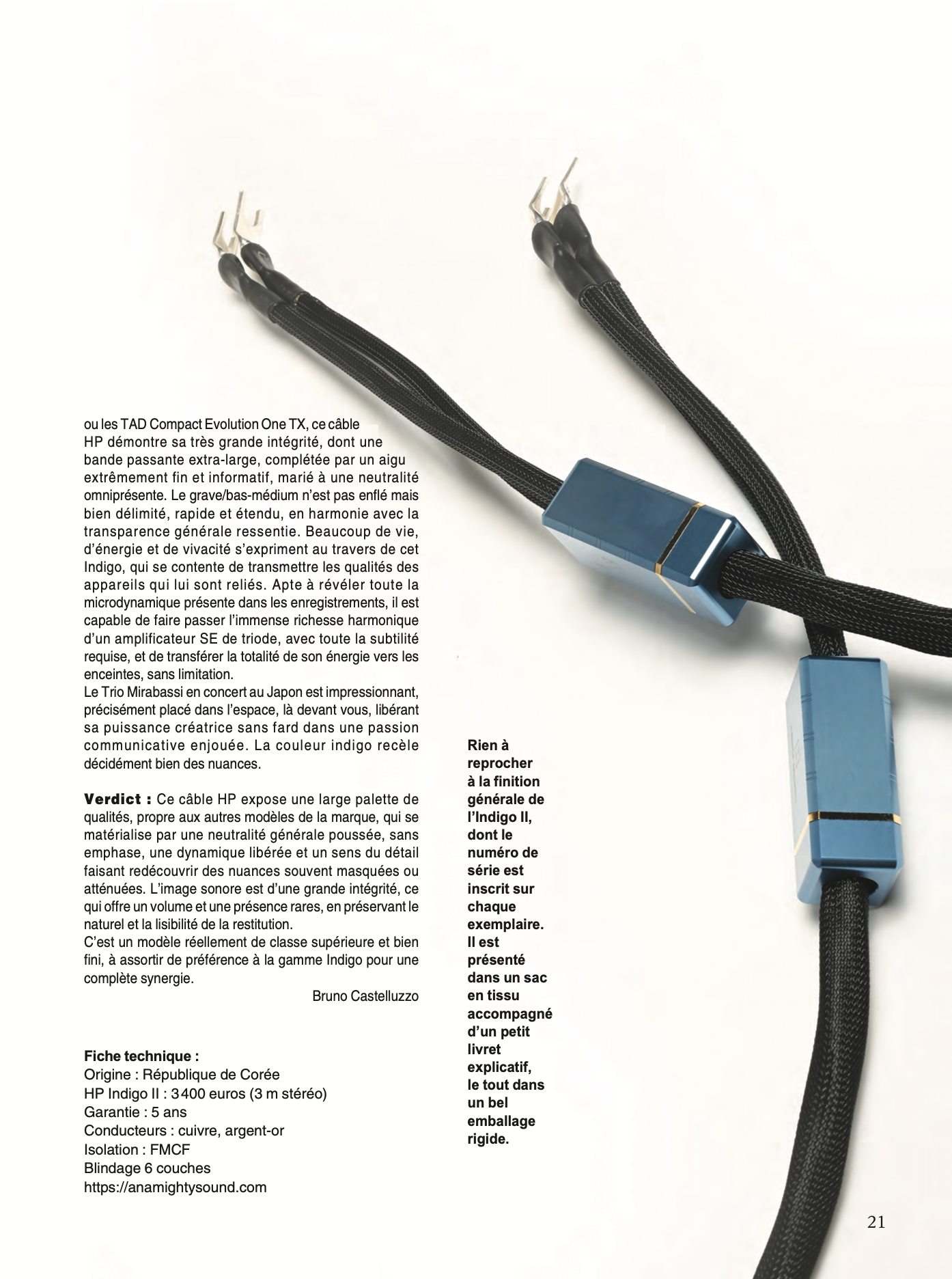Indigo II를 고해상도 스피커인 Stenheim Alumine Two SE 또는 TAD Compact Evolution One TX와 연결해 청음한 결과, 매우 뛰어난 음질의 정직한 해상력을 확인할 수 있었습니다. 이 케이블은 광대역 주파수 응답을 보이며, 고역은 섬세하고 정보량이 풍부하고, 전체적으로 중립적인 성향을 유지합니다.